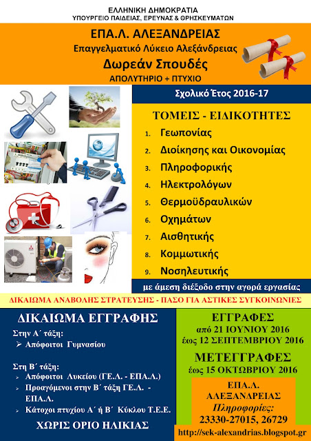 Ξεκινούν οι εγγραφές στο ΕΠΑ.Λ Αλεξάνδρειας Τετάρτη, 22 Ιουνίου 2016 23:25 Γράφτηκε από τον/την Μαρία Τριγώνη Οι εγγραφές για το σχολικό έτος 2016-17 πραγματοποιούνται στο ΕΠΑΛ Αλεξάνδρειας από την Πέμπτη 23 Ιουνίου 2016. ΕΠΑΛ ΑλεξάνδρειαςΔιεύθυνση: Ανώνυμη Πάροδος 28ης Οκτωβρίου, Αλεξάνδρεια ΗμαθίαςΤηλέφωνο: 2333027015, 26729 Προηγούμενο Επόμενο